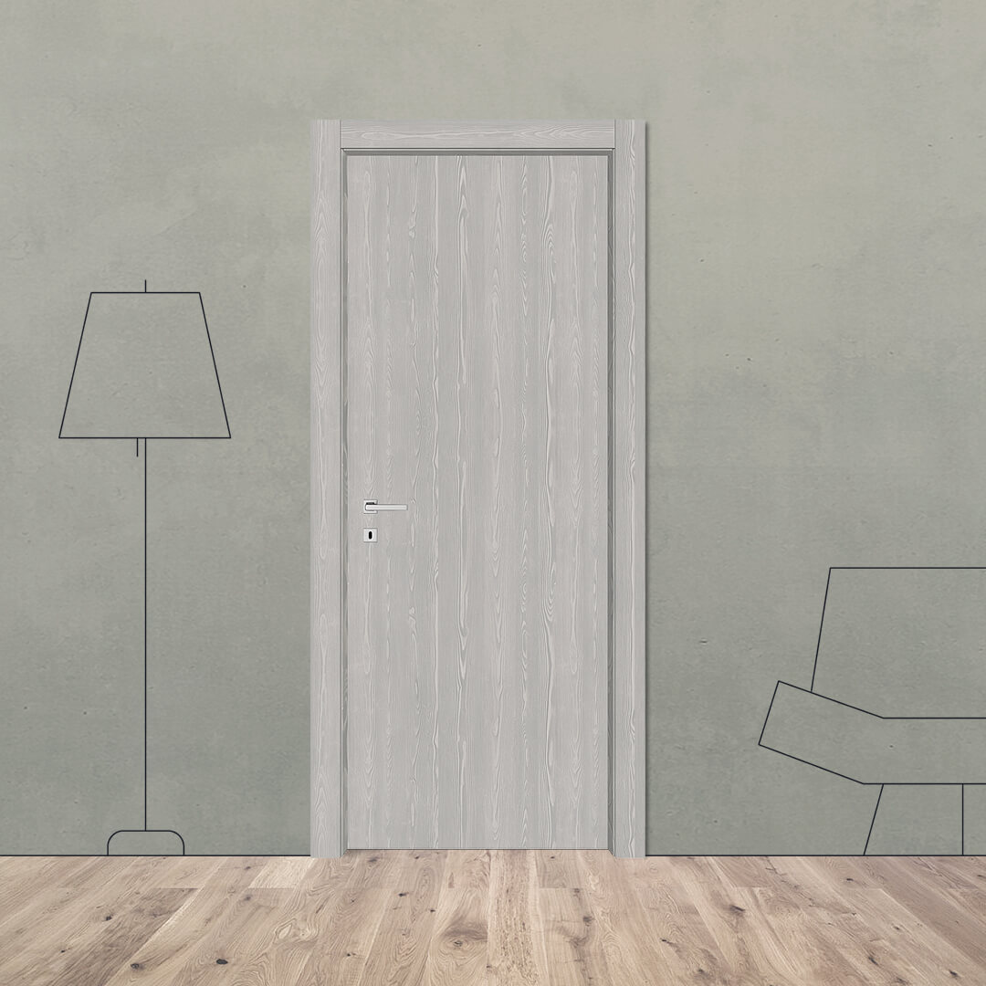 208: con venatura verticale, declinato in varianti che spaziano dalla porta liscia (con o senza inserti in alluminio IA) a quella con svuotatura centrale a vetro (V) o con pannello incassato liscio (L) o bugnato (B).