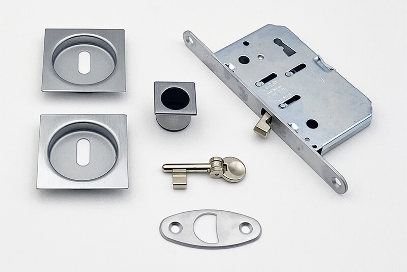 Disponibili con rosetta tonda o quadrata a secondo dei modelli, maniglie a incasso per porte scorrevoli con o senza serratura.